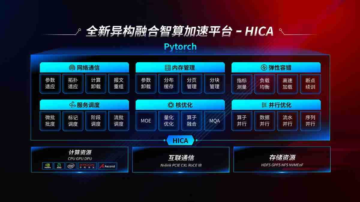 通过自研的服务层、、、中间适配层、、、以及调度编排算法,,,,采用数据并行、、模型并行等多种并行方式,,,,把并行计算任务进行有效的分解,,使其分别由相应的软件栈和算力资源来承接。。。当GPU资源变化,,HICA可以实时动态调度计算子任务并调整模型拓扑和架构,,,以充分聚合各种算力资源。。