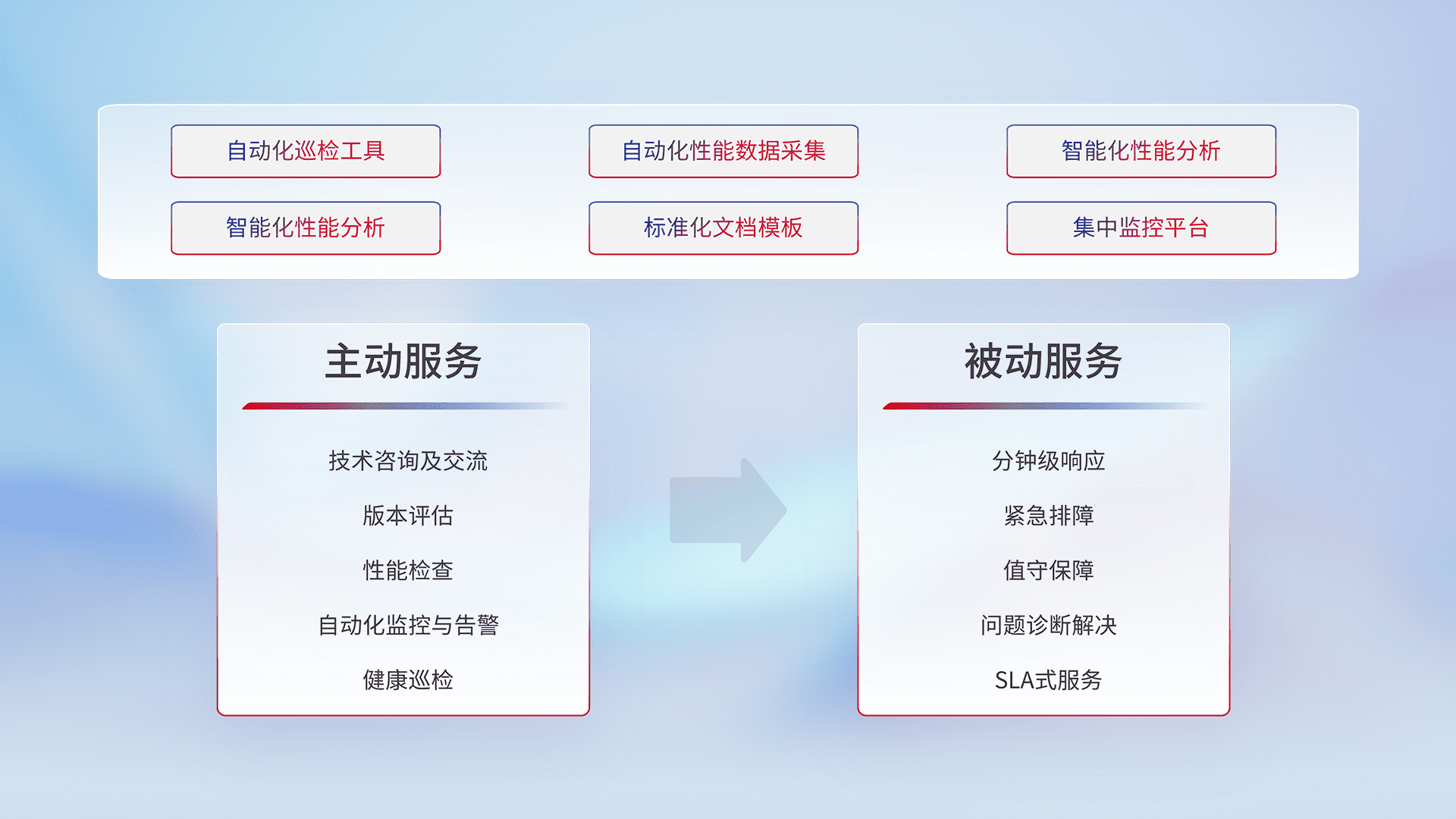 智能化工具和标准化文档,,,保障服务质量,,,,提供主动服务(包含技术咨询、、、、版本评估、、性能检查、、、、自动化监控与告警、、、健康巡检)和被动服务包含(分钟级响应、、紧急排障、、值守保障、、问题诊断解决、、SLA服务)。。