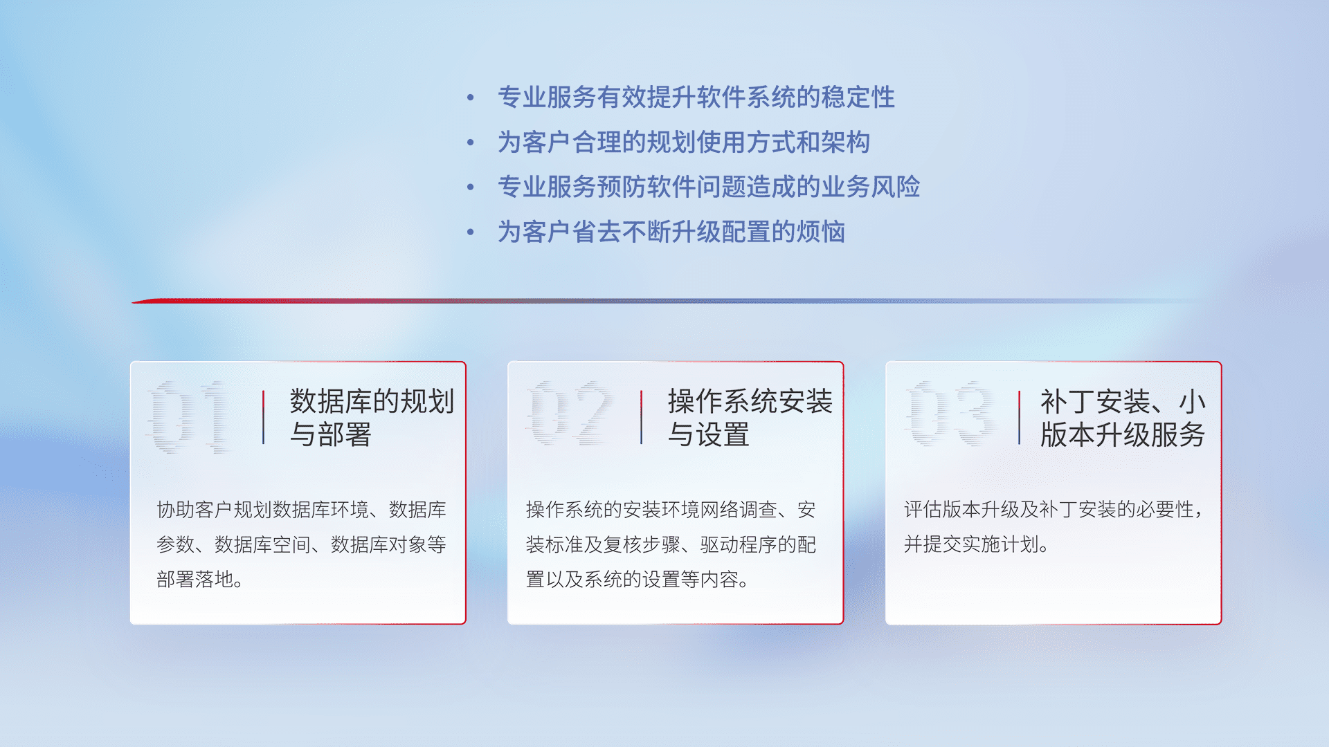 为客户提供软件规模升级、、、、快速部署、、、、按需配置的专业服务,,从数据库的规划与部署到操作系统的安装与设置,,,再到补丁安装和小版本升级提供支持。。